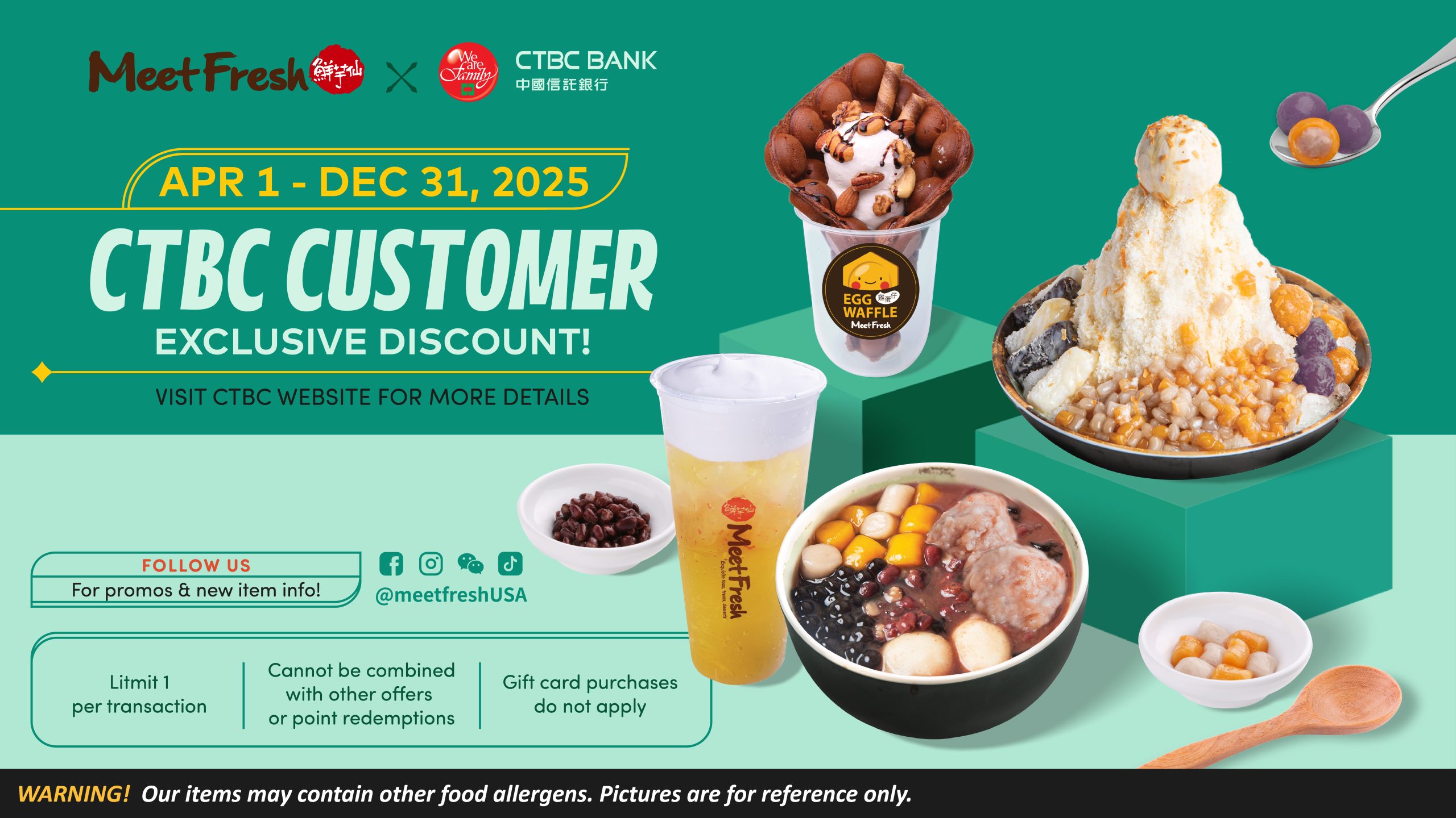 Meet Fresh x CTBC has been extended and is here to stay until December 31, 2025. This is an exclusive deal for all CTBC Customers. You can indulge in the deliciousness of Meet Fresh. View the CTBC website for more details. https://www.ctbcbankusa.com/ctbc-offers/