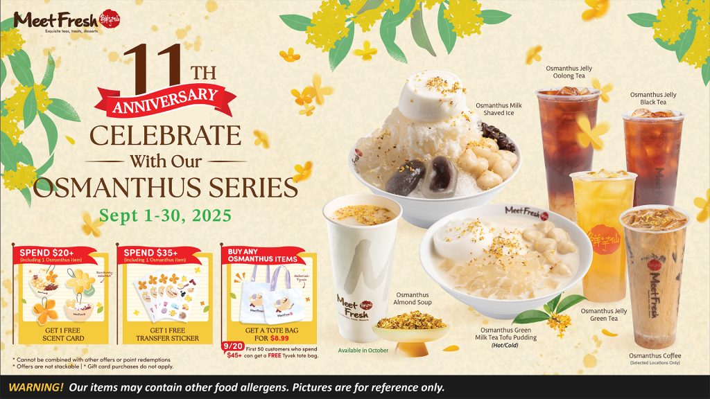 Summer is finally coming to an end, and September is the start of the autumn season. At Meet Fresh, autumn means cozy flavors, the return of our almond series, and a temporary farewell to our fruit series shaved ice. But before we get too ahead of ourselves, it’s time to celebrate something special, the 11th anniversary of Meet Fresh. For 11 years, we’ve been serving up delicious desserts, meeting hundreds of thousands of new faces, and welcoming back loyal customers who have followed us all the way from Taiwan to here. This month, we invite you to celebrate our story and desserts with the launch of our Osmanthus series. We are also giving away free scent cards, Tyvek tote bags, and stickers with this anniversary release.